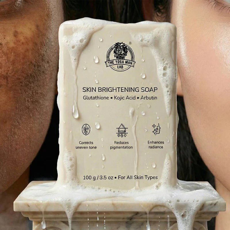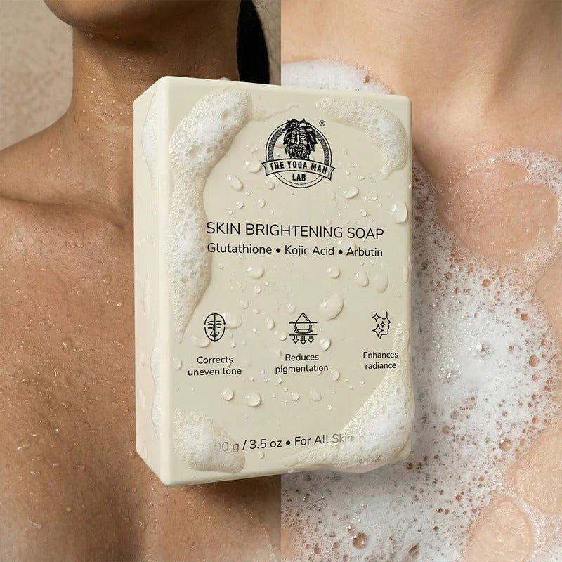 YogaManLab® Glutathione Skin Whitening Kojic Acid Soap is powered by Glutathione, Kojic Acid, and Arbutin. Together they work on melanin production, help reduce existing tan, fade dark patches and acne marks, and support a brighter and more even complexion on face and body.